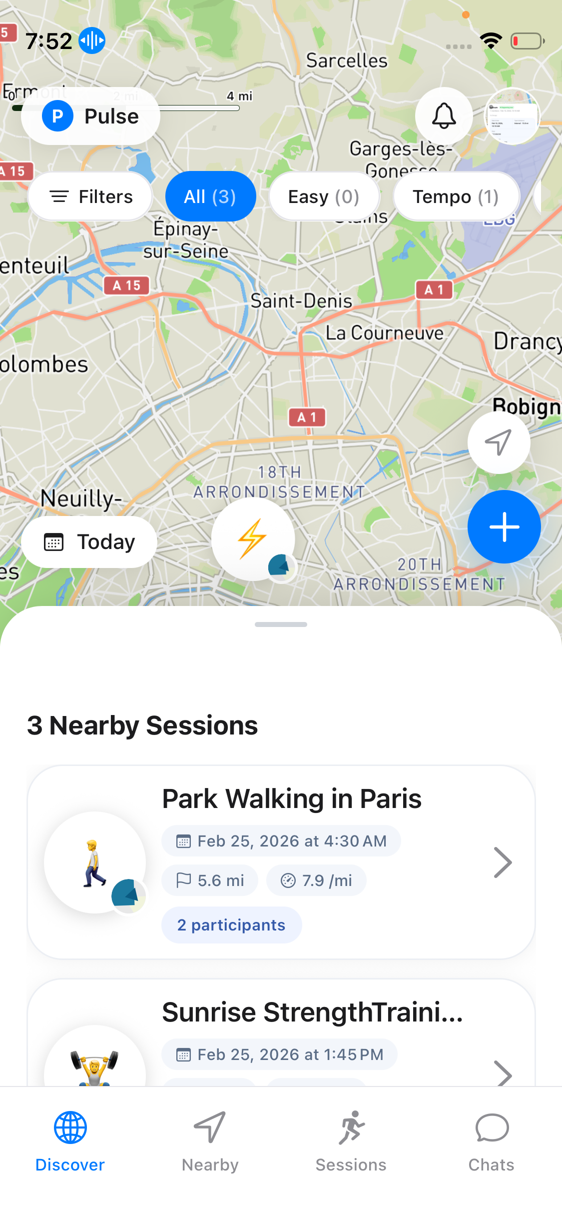 Open the map and explore running sessions around you. Filter by date, distance, pace, and run type to find the perfect match.